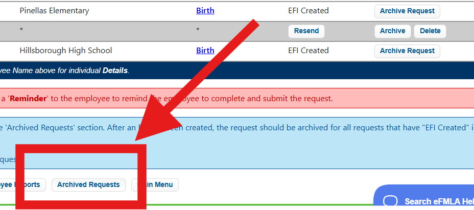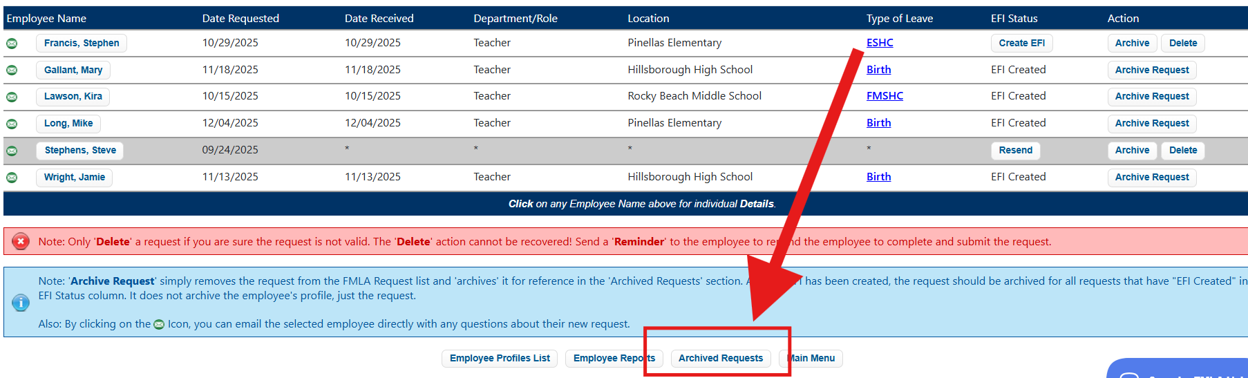 NOTE: Archiving the Request after the EFI has been created does NOT delete the EFI/Profile. It cleans up your list of leave requests, and archives the completed EFI Request in the FMLA Requests Report. You will always be able to see the archived leave requests, if needed.